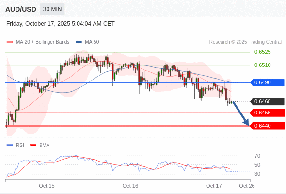在 0.6490 之下,看跌,目标价位为 0.6455 ,然后为 0.6440 。