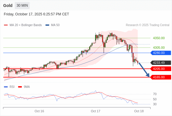 在 4280.00 之下,看跌,目标价位为 4205.00 ,然后为 4165.00 。