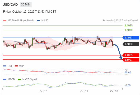 美元/加元 当日内 : 看跌,在 1.4057 之下。