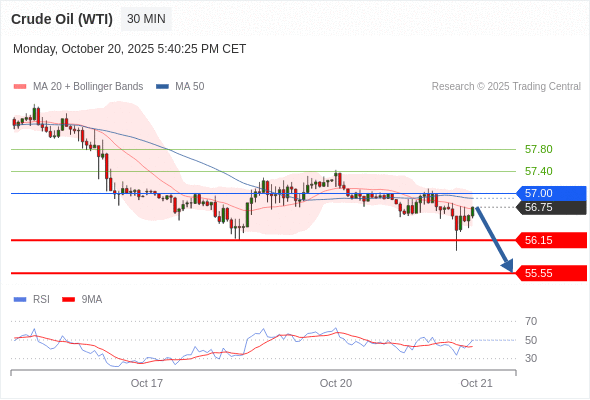 交易策略: 在 57.00 之下,看跌,目标价位为 56.15 ,然后为 55.55 。