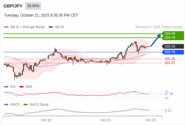 英镑/日元 当日内 : 看涨,当 202.76 为支撑位,目标定在204.09。