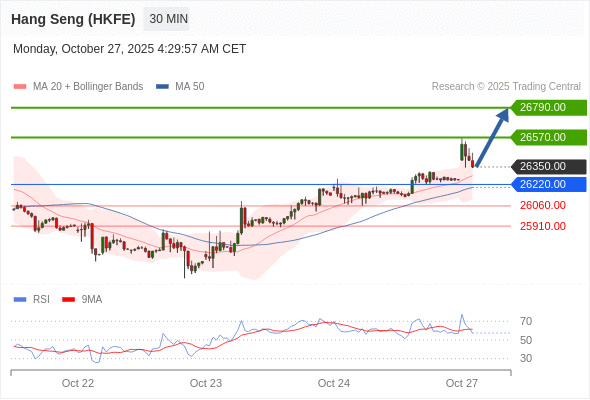 香港恒生指数期货 当日内: 在26220.00之上,看涨。