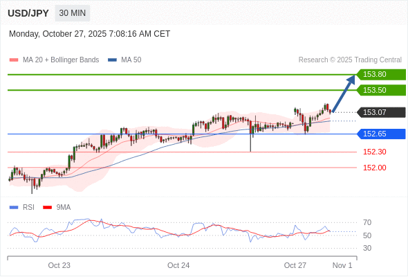 在 152.65 之上,看涨,目标价位为 153.50 ,然后为 153.80 。