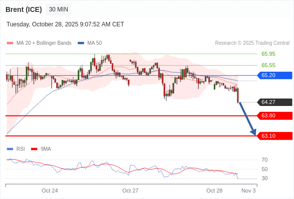 在 65.20 之下,看跌,目标价位为 63.80 ,然后为 63.10 。