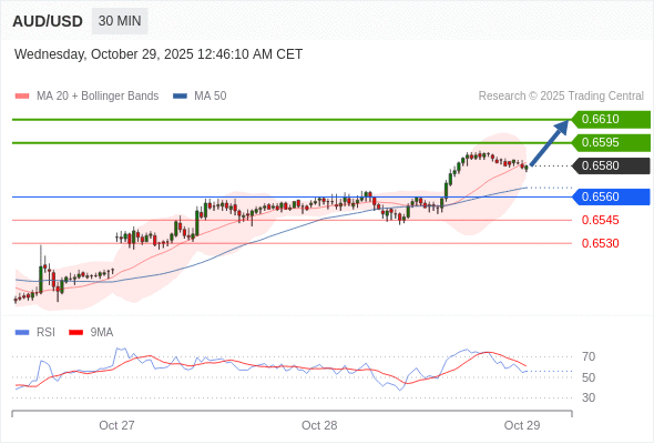 在 0.6560 之上,看涨,目标价位为 0.6595 ,然后为 0.6610 。