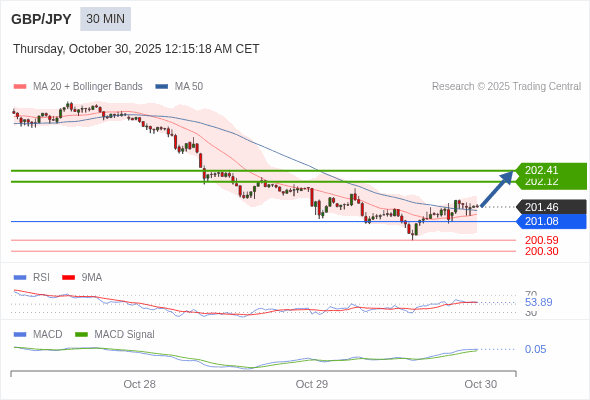 英镑/日元 当日内 : 看涨,当 201.08 为支撑位。