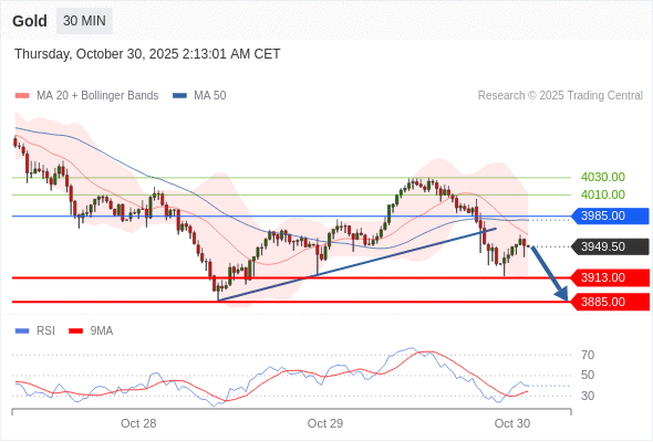 在 3985.00 之下,看跌,目标价位为 3913.00 ,然后为 3885.00 。