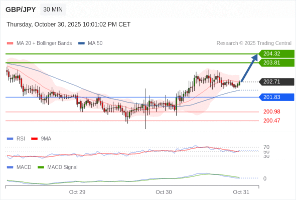 英镑/日元 当日内: 看涨,当 201.83 为支撑位,目标定在204.32。
