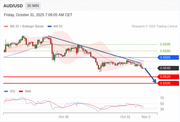在 0.6565 之下,看跌,目标价位为 0.6520 ,然后为 0.6505 。