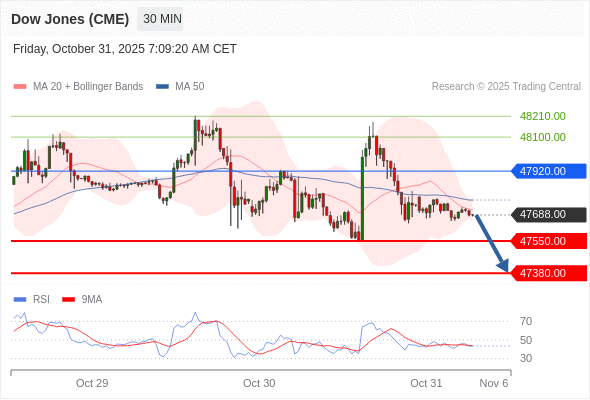 交易策略: 在 47920.00 之下,看跌,目标价位为 47550.00 ,然后为 47380.00 。
