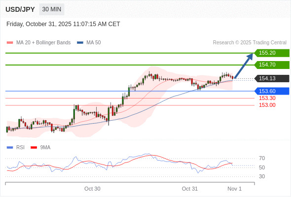 在 153.60 之上,看涨,目标价位为 154.70 ,然后为 155.20 。