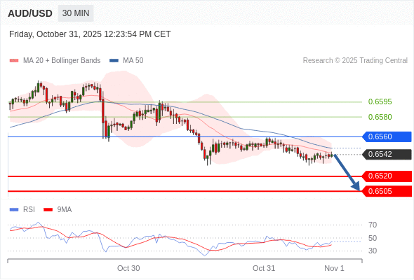 在 0.6560 之下,看跌,目标价位为 0.6520 ,然后为 0.6505 。