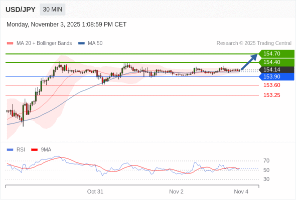 在 153.90 之上,看涨,目标价位为 154.40 ,然后为 154.70 。