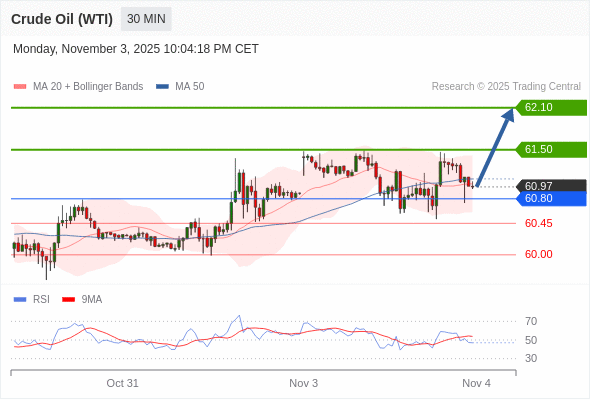 在 60.80 之上,看涨,目标价位为 61.50 ,然后为 62.10 。