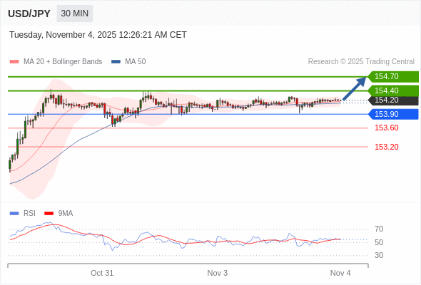 在 153.90 之上,看涨,目标价位为 154.40 ,然后为 154.70 。