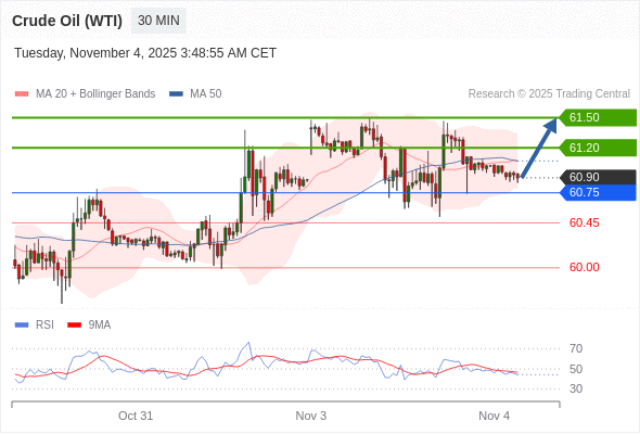 在 60.75 之上,看涨,目标价位为 61.20 ,然后为 61.50 。