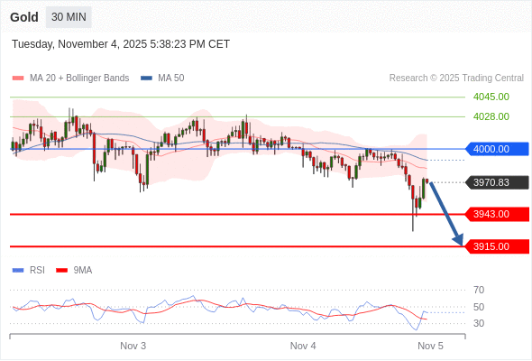 在 4000.00 之下,看跌,目标价位为 3943.00 ,然后为 3915.00 。
