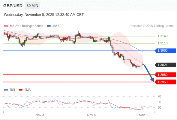 在 1.3080 之下,看跌,目标价位为 1.2980 ,然后为 1.2950 。