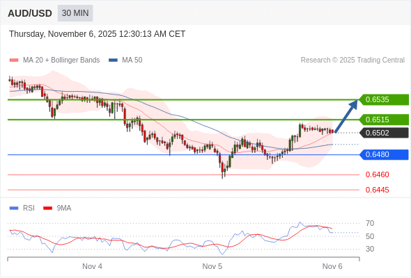 在 0.6480 之上,看涨,目标价位为 0.6515 ,然后为 0.6535 。