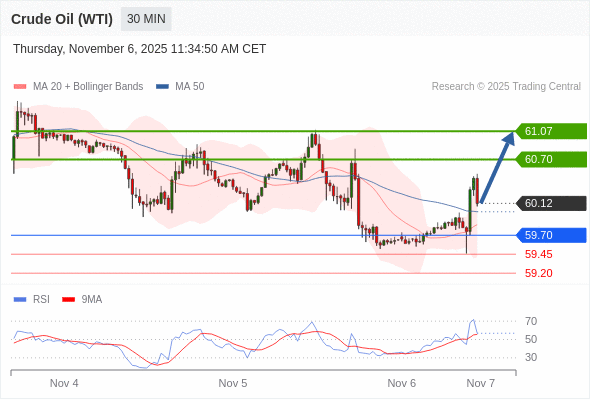 在 59.70 之上,看涨,目标价位为 60.70 ,然后为 61.07 。