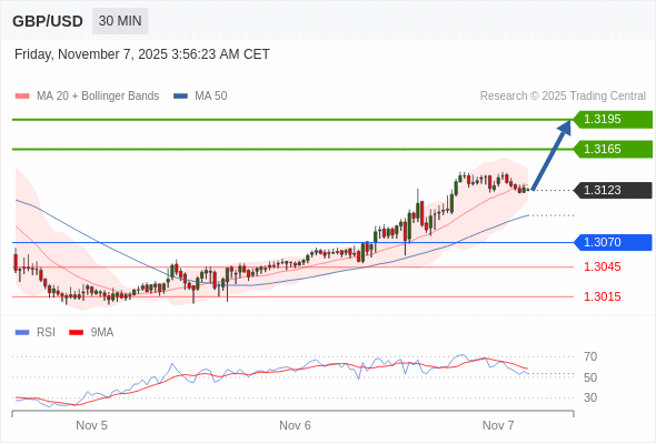 在 1.3070 之上,看涨,目标价位为 1.3165 ,然后为 1.3195 。