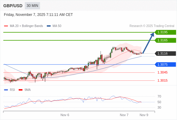 在 1.3075 之上,看涨,目标价位为 1.3165 ,然后为 1.3195 。