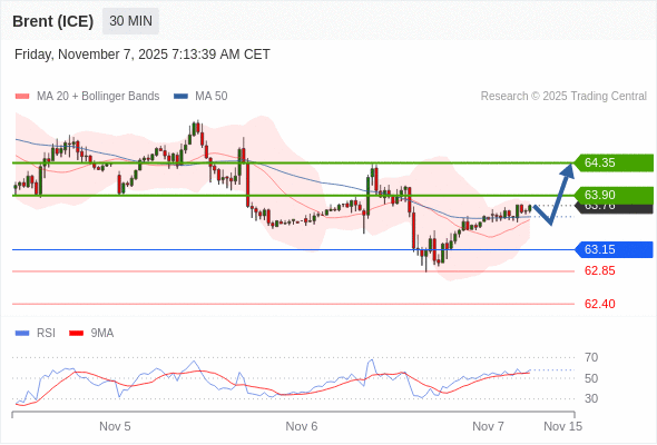 在 63.15 之上,看涨,目标价位为 63.90 ,然后为 64.35 。