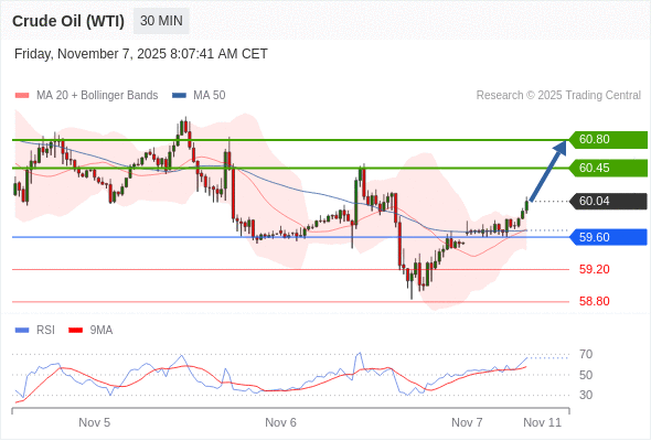 在 59.60 之上,看涨,目标价位为 60.45 ,然后为 60.80 。