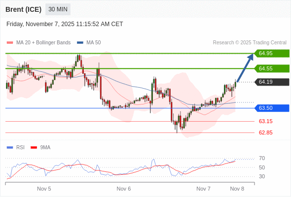在 63.50 之上,看涨,目标价位为 64.55 ,然后为 64.95 。