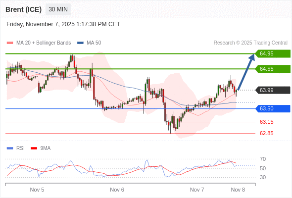 在 63.50 之上,看涨,目标价位为 64.55 ,然后为 64.95 。