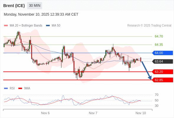在 64.00 之下,看跌,目标价位为 63.20 ,然后为 62.85 。
