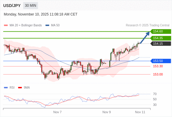 在 153.50 之上,看涨,目标价位为 154.35 ,然后为 154.60 。