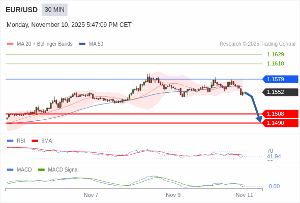 欧元/美元 当日内 : 看跌,在 1.1579 之下。