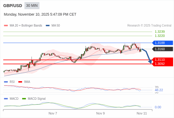 英镑/美元 当日内 : 逐渐下跌,当 1.3188 阻碍上行,则 1.3092 为目标位。