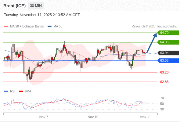 在 63.65 之上,看涨,目标价位为 64.35 ,然后为 64.70 。