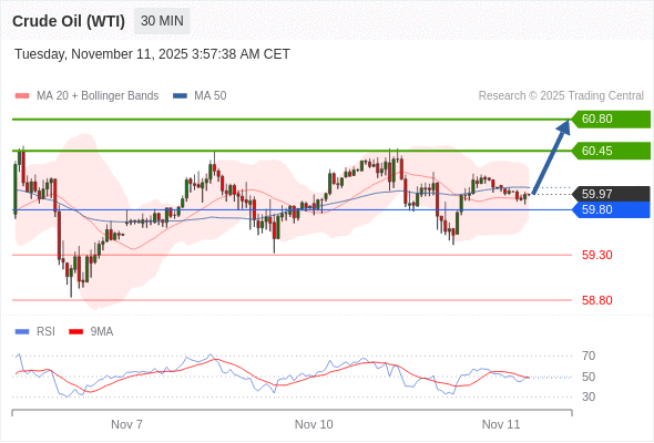 在 59.80 之上,看涨,目标价位为 60.45 ,然后为 60.80 。