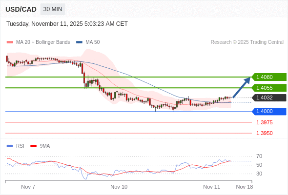 在 1.4000 之上,看涨,目标价位为 1.4055 ,然后为 1.4080 。