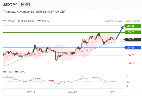 在 154.35 之上,看涨,目标价位为 155.05 ,然后为 155.35 。