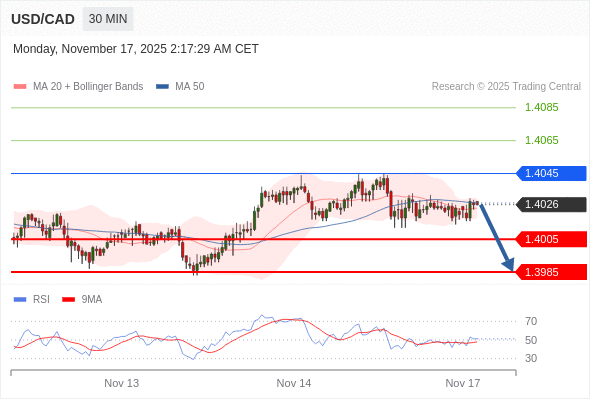 在 1.4045 之下,看跌,目标价位为 1.4005 ,然后为 1.3985 。
