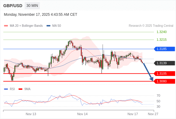 在 1.3185 之下,看跌,目标价位为 1.3105 ,然后为 1.3080 。