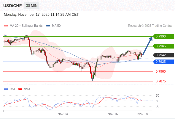 在 0.7925 之上,看涨,目标价位为 0.7965 ,然后为 0.7990 。