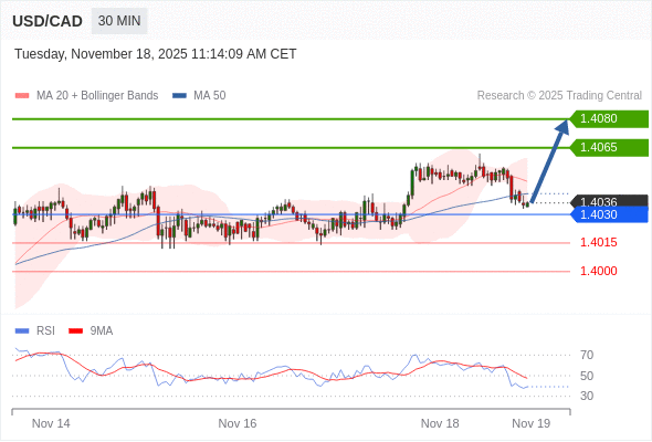 在 1.4030 之上,看涨,目标价位为 1.4065 ,然后为 1.4080 。