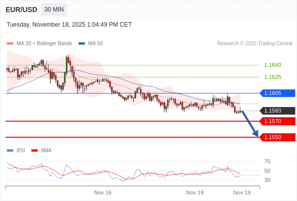 在 1.1605 之下,看跌,目标价位为 1.1570 ,然后为 1.1550 。