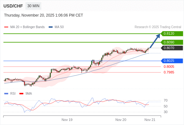 在 0.8025 之上,看涨,目标价位为 0.8090 ,然后为 0.8120 。