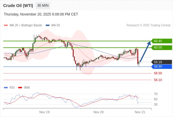 在 58.90 之上,看涨,目标价位为 60.05 ,然后为 60.45 。
