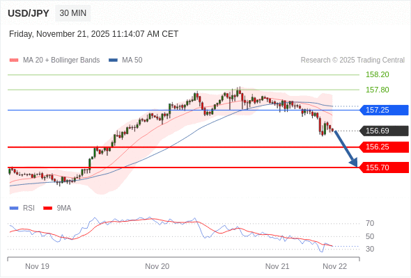 在 157.25 之下,看跌,目标价位为 156.25 ,然后为 155.70 。