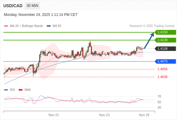 在 1.4075 之上,看涨,目标价位为 1.4130 ,然后为 1.4150 。