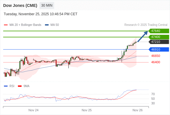 在 46910 之上,看涨,目标价位为 47400 ,然后为 47640 。