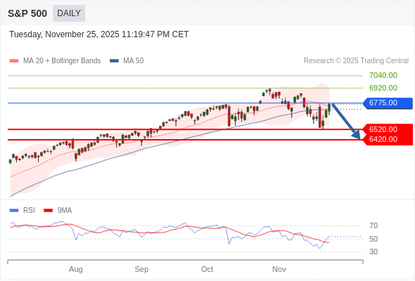 交易策略: 在 6775.00 之下,看跌,目标价位为 6520.00 ,然后为 6420.00 。