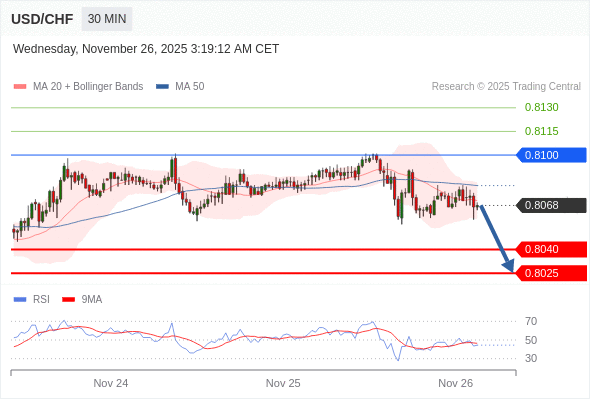 在 0.8100 之下,看跌,目标价位为 0.8040 ,然后为 0.8025 。